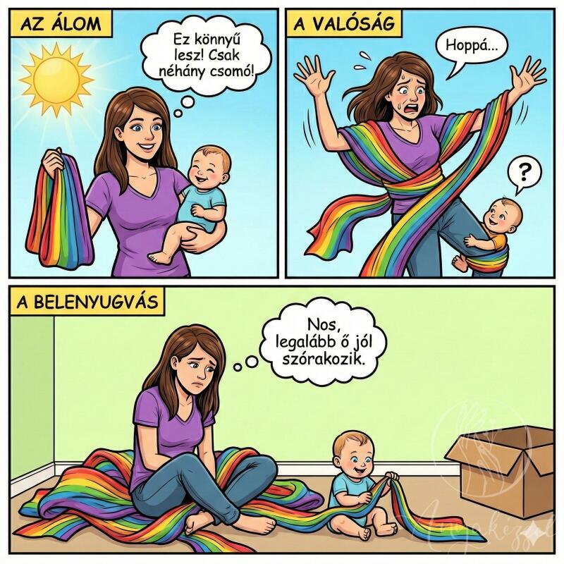 A kép szépen megmutatja azt a tipikus szülői utat, ami a lelkesedéstől a káoszon át a békés megadásig vezet. A legfontosabb üzenet talán az, hogy nem kell mindennek tökéletesnek lennie – amíg a baba jól érzi magát, addig nagy baj nem lehet, még ha a kendő a földön is végzi, azonban fontos tudnod, hogy nem csak a kendő létezik. Néhány kérdés után szívesen mutatok olyan alternatívákat, amiből meg tudod találni, ami a kezedben és a szívedben már benne van a kendő mellett.